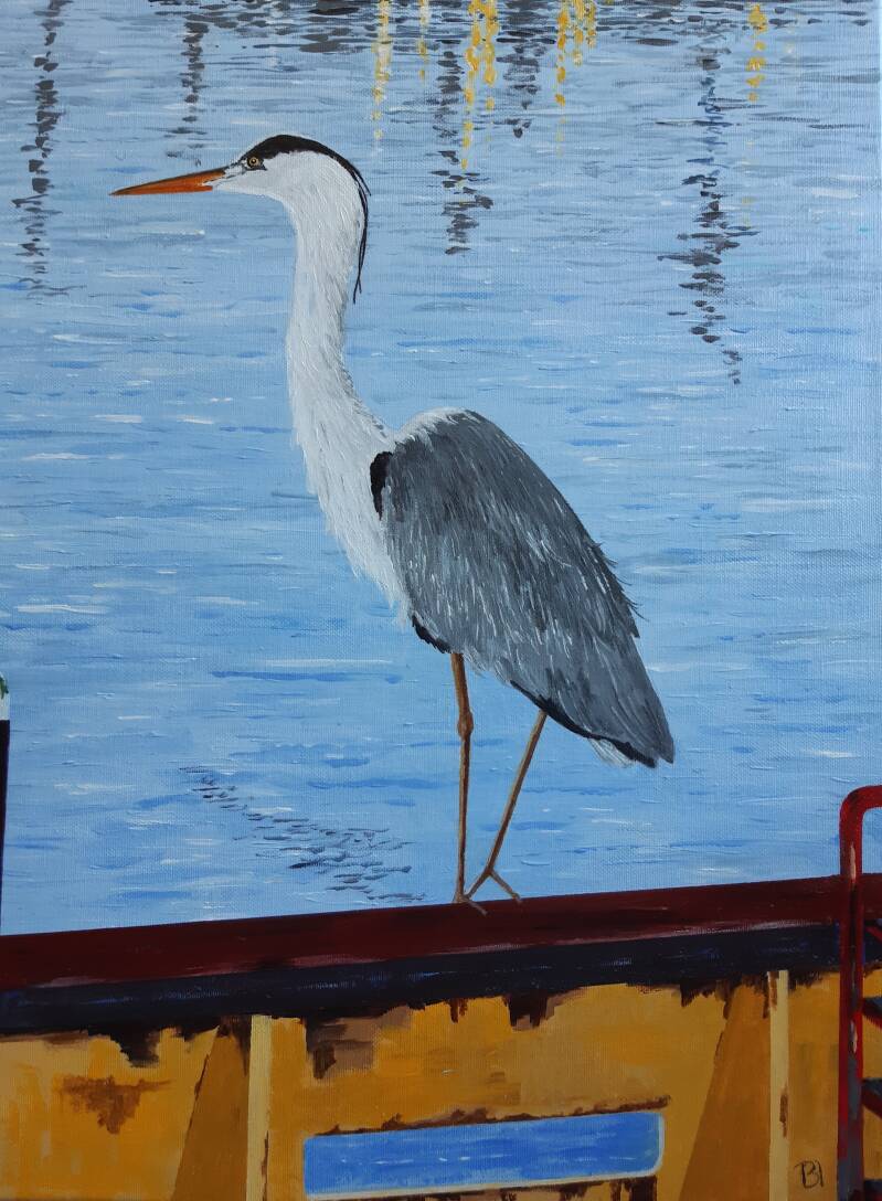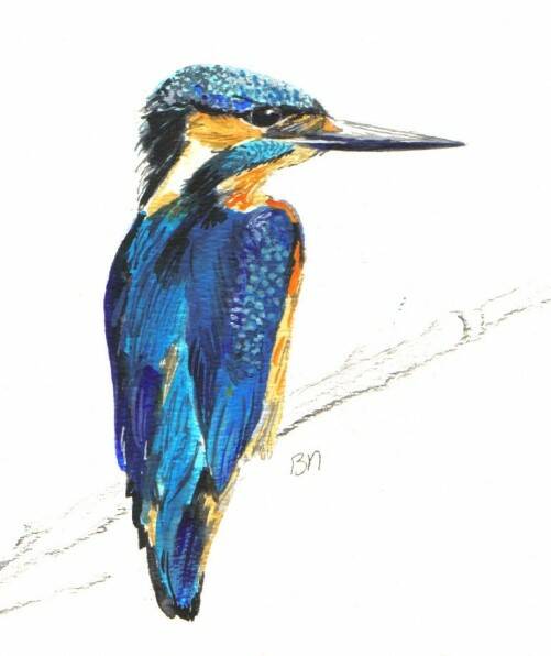 Het ijsvogeltje, zat lang genoeg voor het keukenraam om het te kunnen schilderen. Aquarel 30 x 40 cm